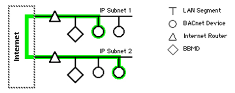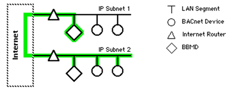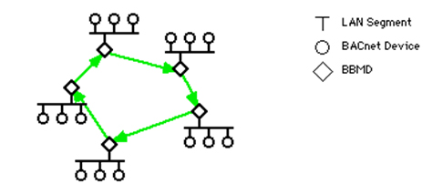 為了確保廣播消息不會(huì)在所有子網(wǎng)中路由,引入了BACnet廣播管理設(shè)備(BACnet Broadcast Management Device,BBMD)。很多功能,比如動(dòng)態(tài)name綁定、值改變通知都會(huì)廣播,通過(guò)BBMD把這些消息限制在各自的網(wǎng)絡(luò)中。